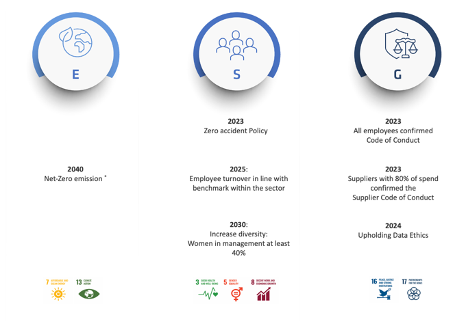 UFS markmið Eimskip kynnt ný UFS markmið árið 2023. Félagið hefur sett metnarfull markmið um að draga úr kolefnisfótspori og stefnir á kolefnishlutleysi árið 2040. Félagið hefur greint ítarlega þá sjálfbærniþætti sem eru mikilvæg félaginu og sett sér metnaðarfull markmið.
