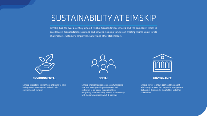 Eimskip vinnur eftir leiðbeiningum frá Nasdaq. ESG inniheldur 30 mælikvarða sem auðvelda birtingu upplýsinga á skýran og aðgengilegan hátt er varðar umhverfi (e. Environmental), félagslegir þættir (e. Social) og stjórnarhættir (e. Governance).
